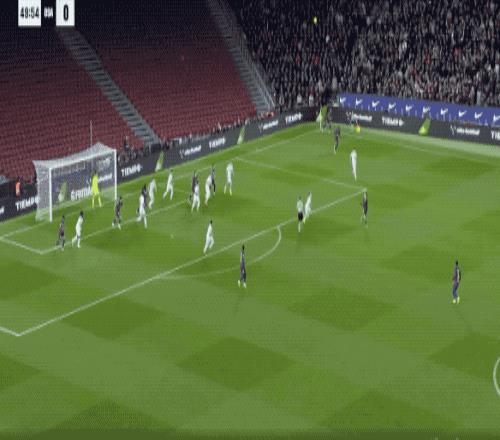 上半场结束,两队互交白卷。两队射门13-2,但巴萨只有2次射正,纵然拥有81%的控球率,也无法破门。